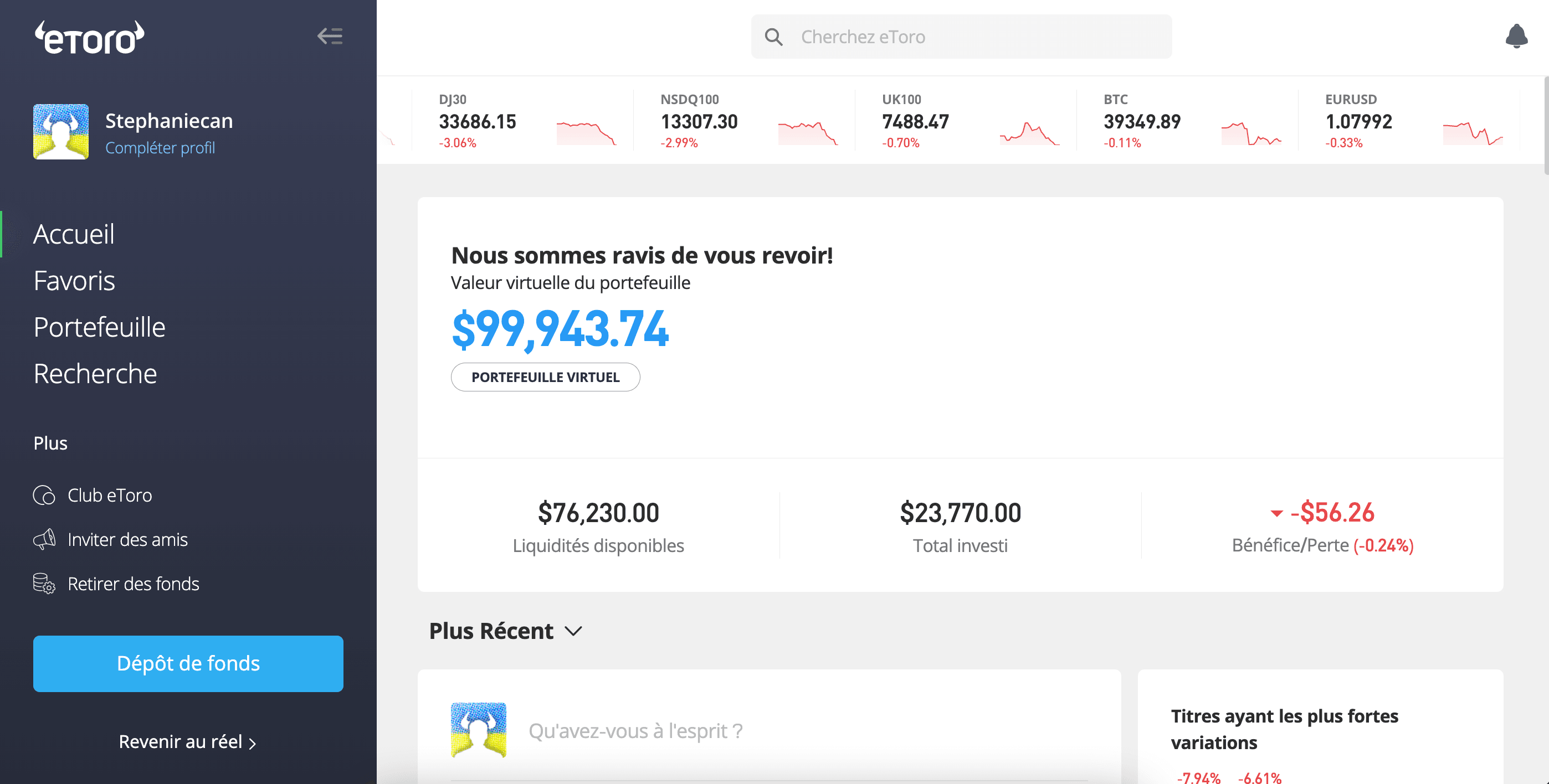 Une fois votre premier dépôt de fonds effectué, vous pouvez commencer à investir sur eToro :