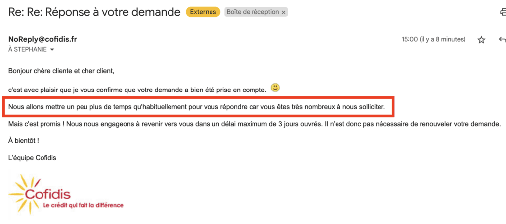 Nous avons apprécié cet email agréable et moins générique que la normale, ainsi que la précision du fait qu'ils reçoivent beaucoup de demandes et que le délai de réponse est plus long que d'habitude.