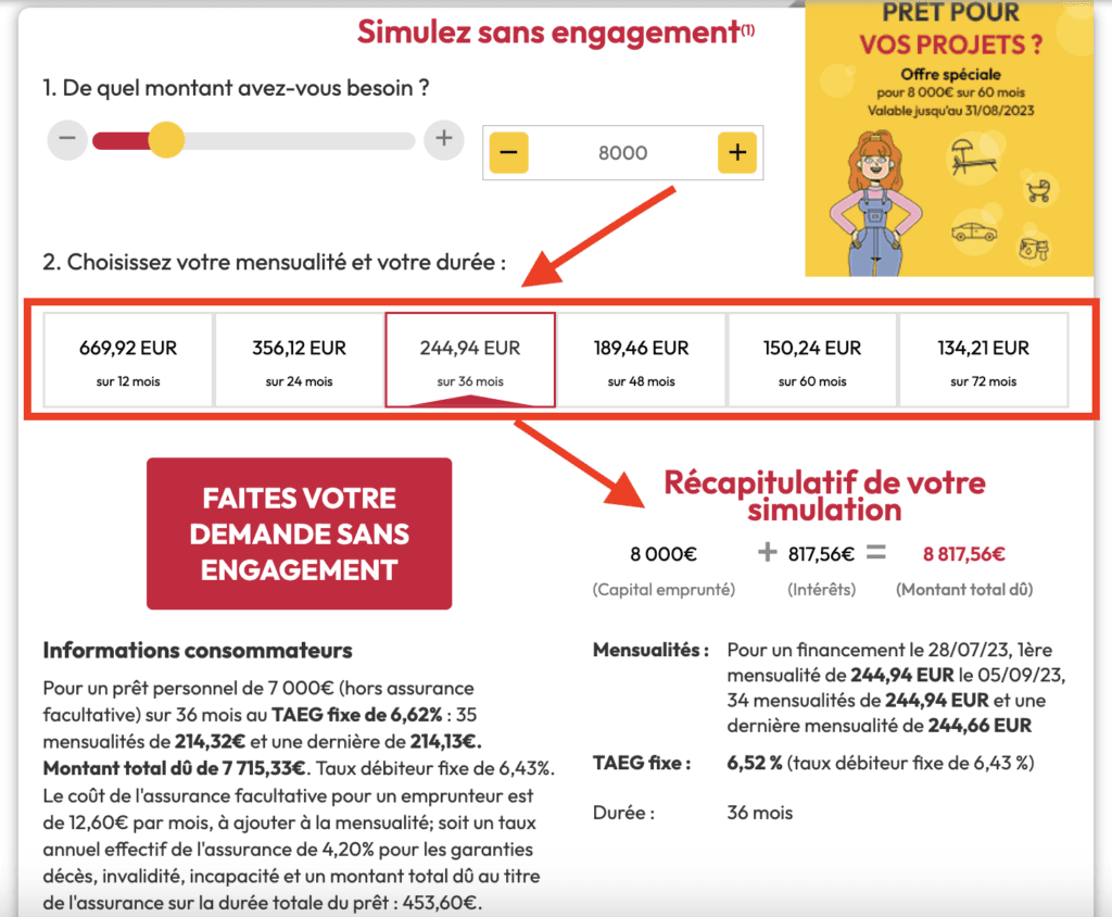 Choisissez la mensualité et la durée de remboursement qui vous convient le plus, puis cliquez sur Demandez sans engagement pour lancer le formulaire de demande.