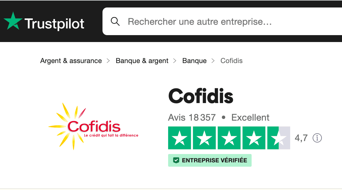 Vous souhaitez emprunter chez l'organisme ayant les meilleurs avis clients sur le Web : Cofidis est noté 4,8/5 sur Avis Vérifiés, et 4,7/5 sur Trustpilot, les deux plus gros site d'avis clients.