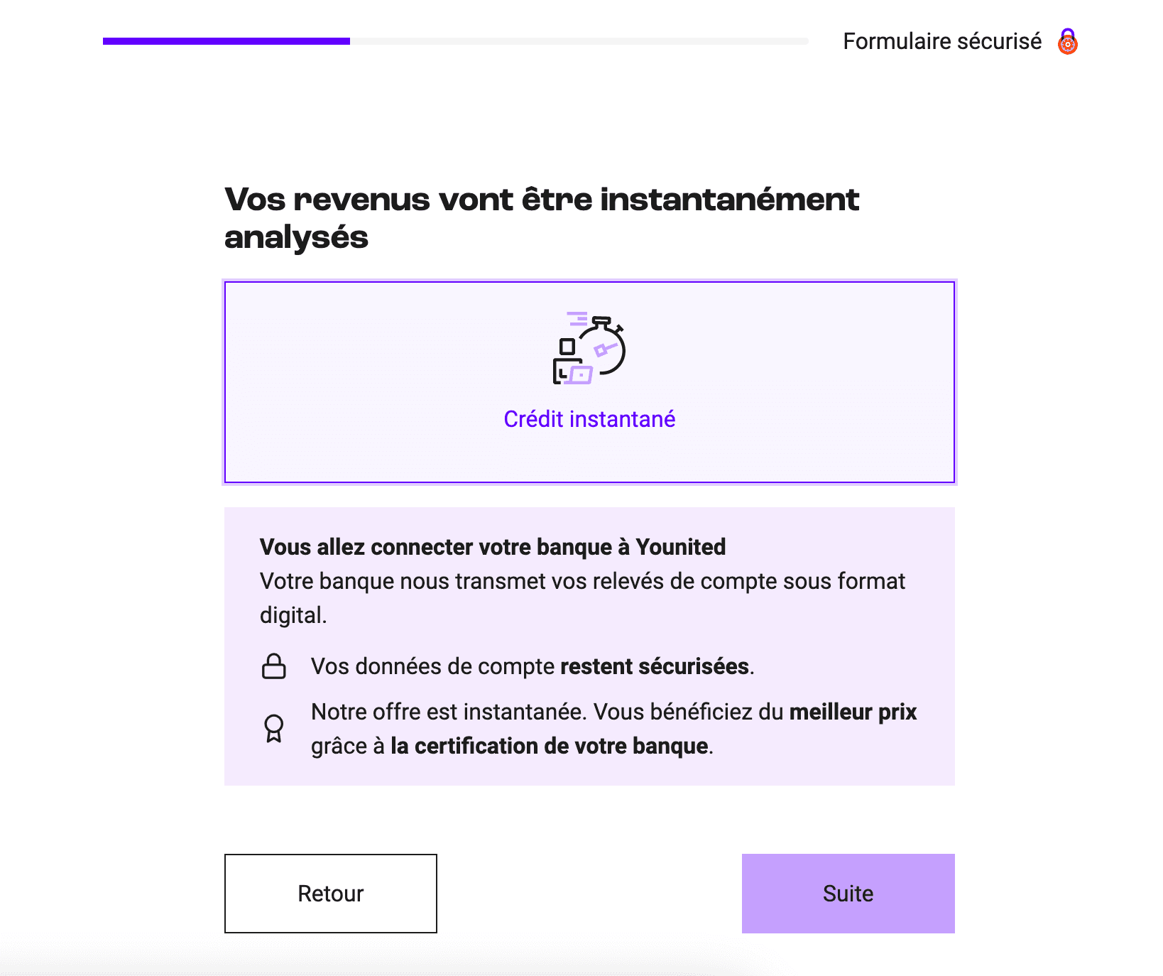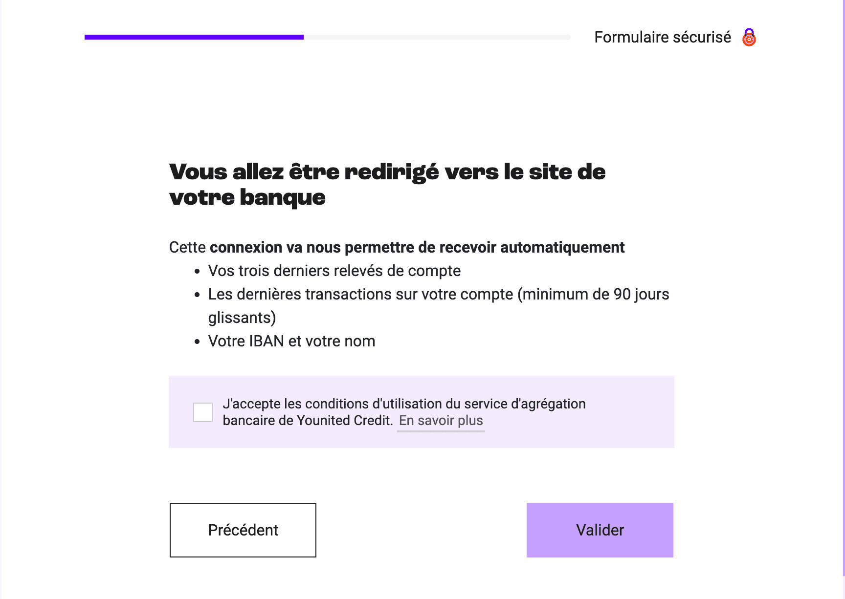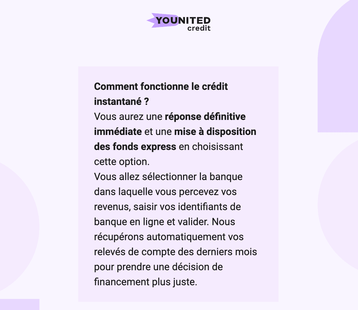 Son point fort est son connecteur bancaire permettant à Younited Credit d'avoir accès instantanémement aux informations et documents dont il a besoin pour vous donner une réponse définitive et vous verser les fonds.