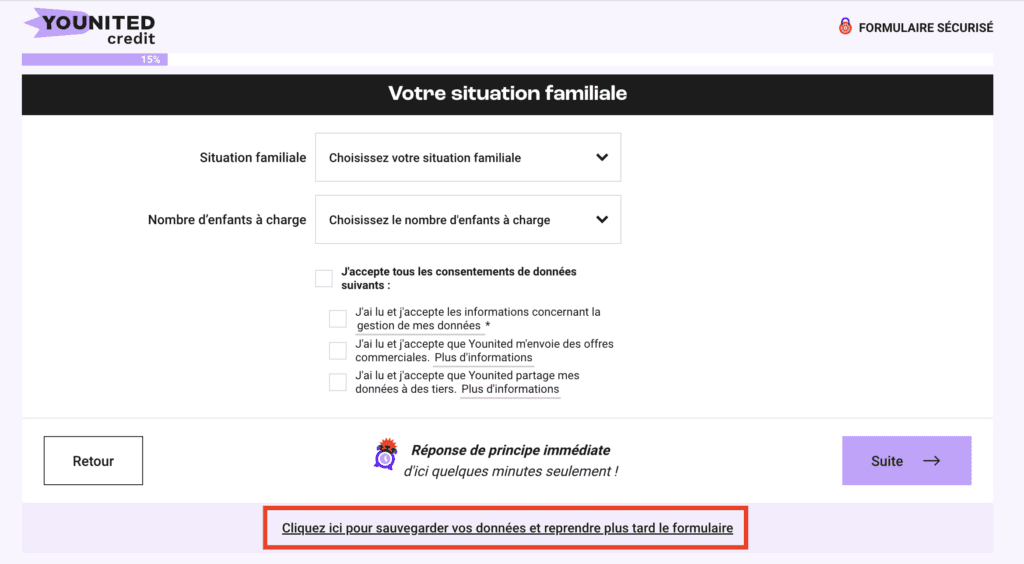 Note : ce que nous avons apprécié avec le formulaire de demande de prêt Younited Credit, c’est l’option de sauvegarder ses données et de reprendre le formulaire plus tard, si besoin. Cette option n’est pas courante.