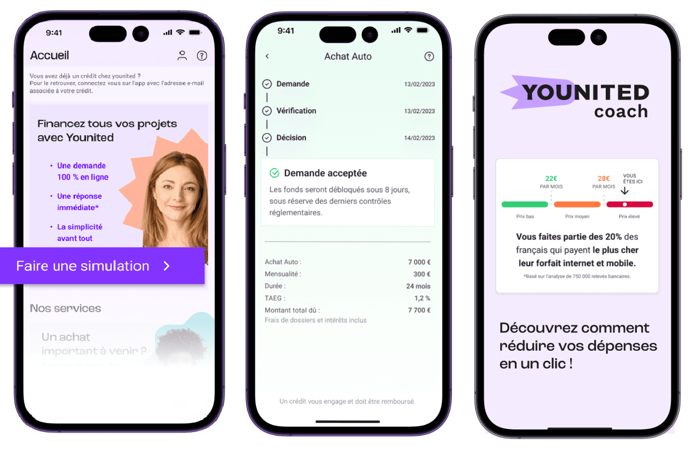 Si vous choisissez Younited Credit, vous êtes assuré d’emprunter auprès d’un organisme de confiance, avec le taux d'appel le plus attractif du marché et un connecteur bancaire qui vous permet de faire un crédit express.