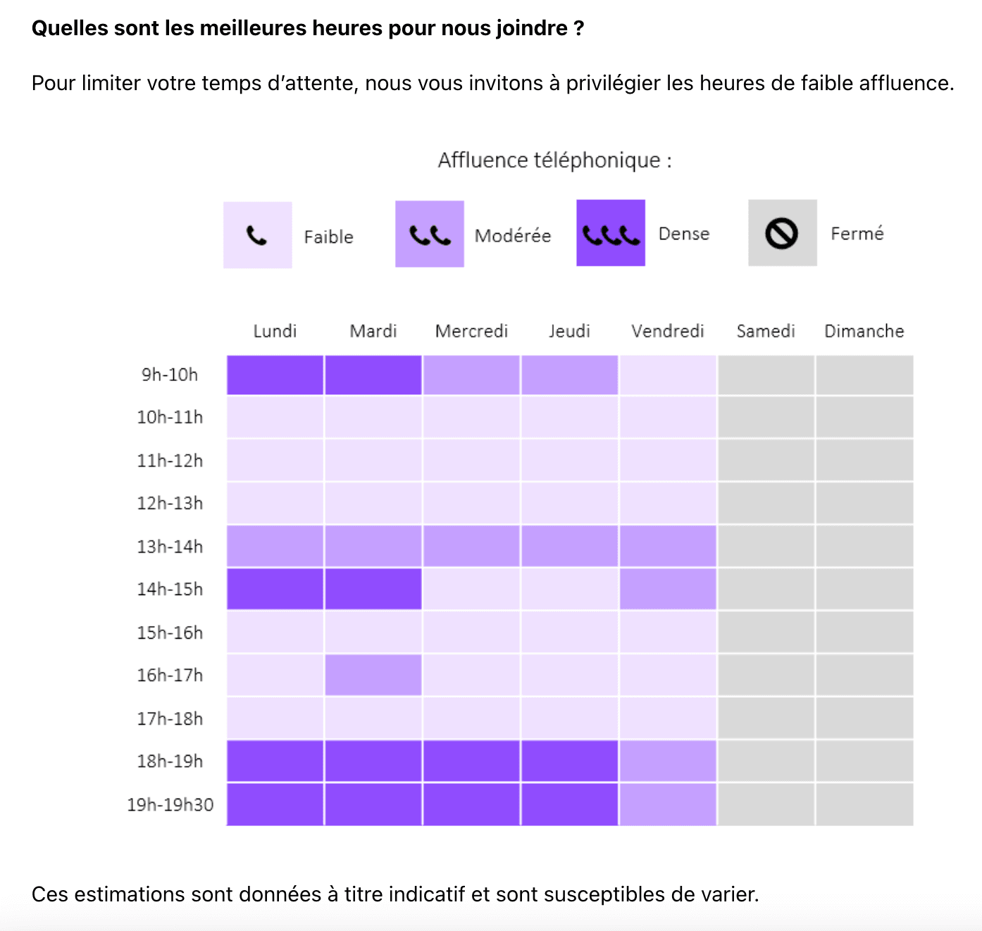 Ce que nous apprécions particulièrement avec cet organisme, c'est qu'il indique sur sa page Contact l'affluence téléphonique de chaque plage horaire. Ce qui permet de savoir quand il sera plus facile de joindre le service client, et ainsi ne pas perdre de temps inutilement.