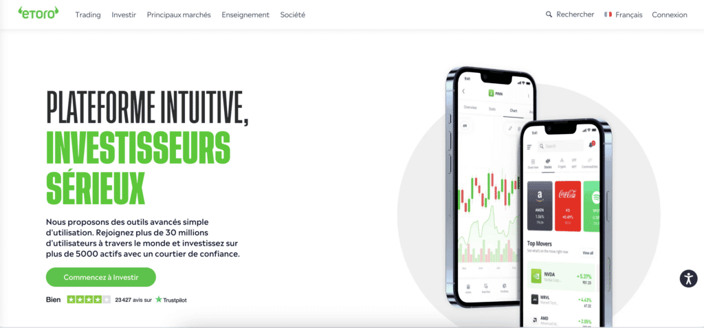 Si vous êtes débutant, nous vous recommandons eToro. C'est la 1ère plateforme de trading dans le monde et parmi les plus populaires en France.